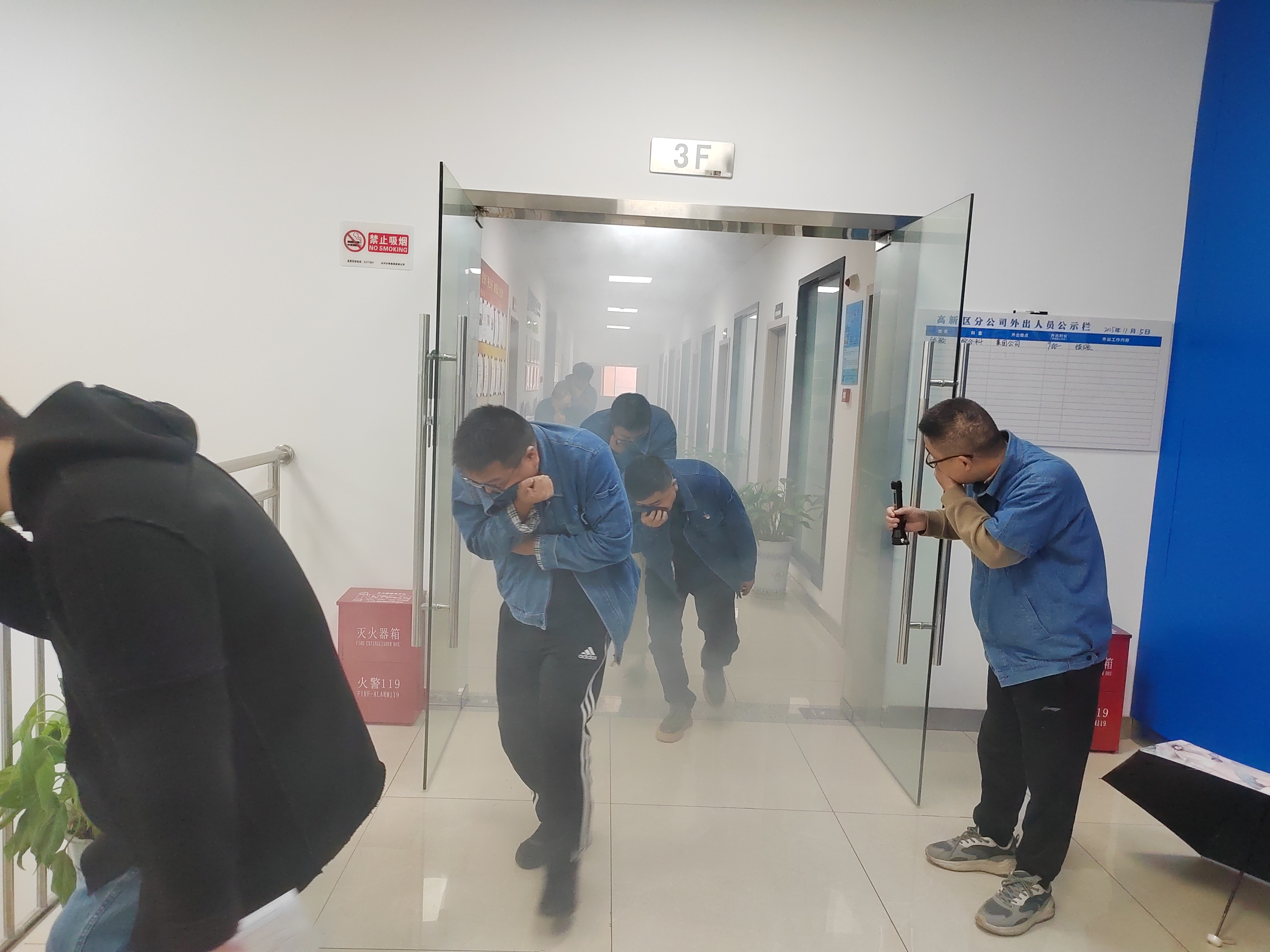 消防疏散演練模擬現(xiàn)場。警報聲響起,全體員工迅速行動,彎腰低頭、捂住口鼻,按預(yù)定路線有條不紊穿過“火災(zāi)煙霧現(xiàn)場”。整個過程中,員工嚴格遵守要求,冷靜應(yīng)對,展現(xiàn)良好應(yīng)急反應(yīng)能力。